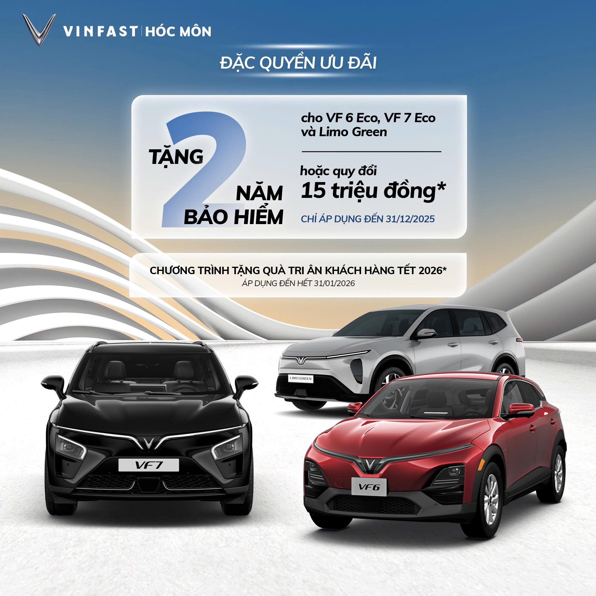 19-12-2025 09:28VF 6 Eco không chỉ là những mẫu SUV điện thông minh, mà còn là “tuyên ngôn” về một phong cách sống xanh, hiện đại cho cả bạn và doanh nghiệp. CHỈ HẾT 31/12 - TẶNG 2 NĂM BẢO HIỂM CHO VF 6 Eco, VF 7 Eco & LIMO GREEN TỚI 31/12/2025